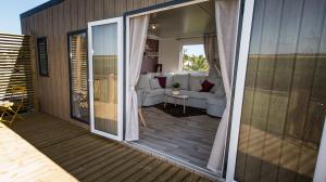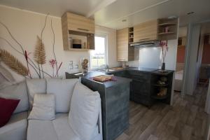 Ce mobil-home de standing de 40m² peut accueillir jusqu’à 6 personnes. Il dispose d’un magnifique séjour lumineux avec une cuisine toute équipée. Adapté pour y vivre à l’année, il est fait pour recevoir une famille ou des amis avec son grand canapé confortable en U. Vous pourrez vous y détendre et y passer un moment inoubliable à plusieurs que ce soit à l’intérieur ou à l’extérieur ! Un salon de jardin est aménagé pour votre plus grand confort sur sa superbe terrasse de + de 35 m².